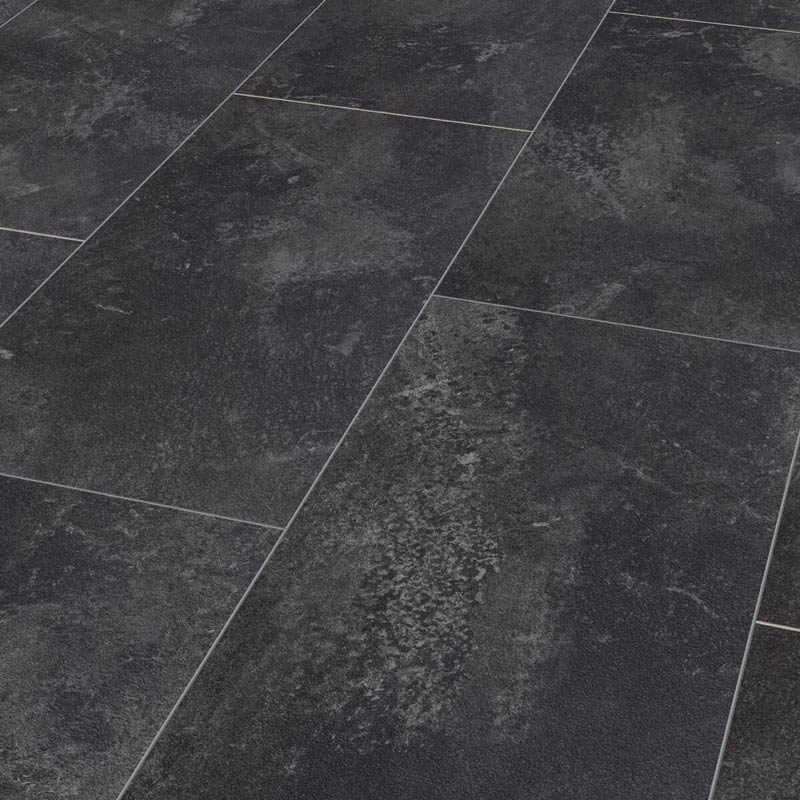 Mega Plus 3079 Himalaya on kaunis musta / tummanharmaa kivikuosinen laattalaminaatti. Sävyltään Himalaya erittäin tumma, mutta ei kuitenkaan täysin musta. Hienostunut kivikuvio on hillitty ja erittäin tyylikäs. Laattojen reunoissa on viisteet luoden laattojen väliin harmaat saumat. Laminaatin pinnassa on hieman epätasainen kivistruktuuri, joka tuntuu miellyttävälle jalan alla.