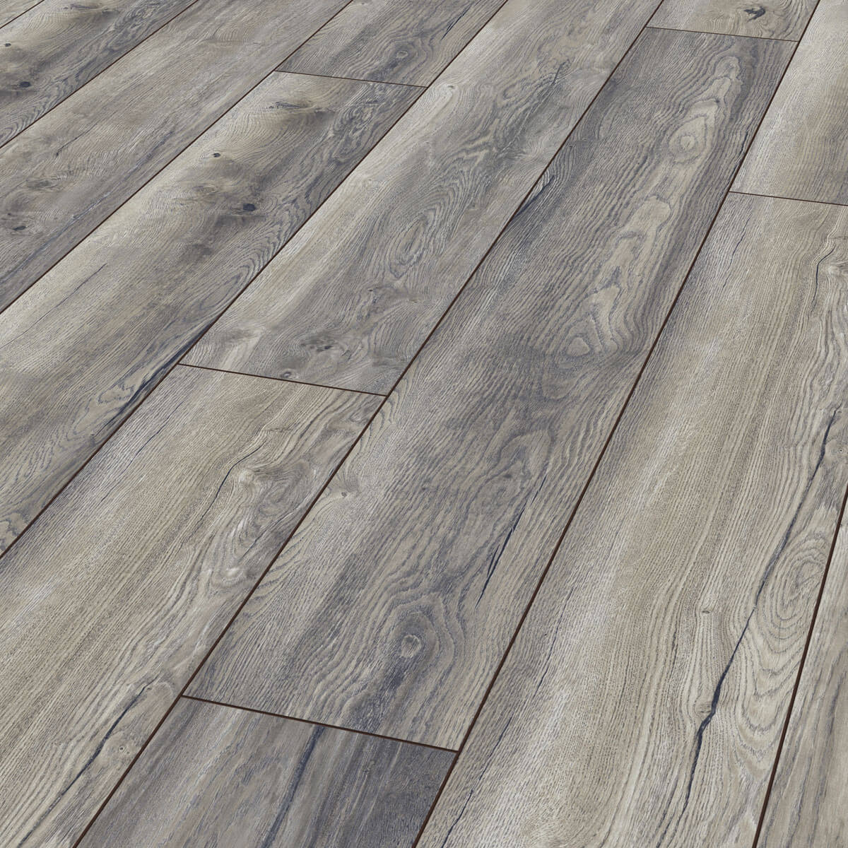 Exquisit Plus 3572 Harbour Oak Grey on näyttävä harmaa tammilaminaatti, joka on reilun rustiikkinen – oksat, halkeamat ja sävynvaihtelut tuovat siihen elävyyttä ja luonnetta. Harmaassa lankussa on nähtävissä myös vivahteita ruskeaan, jotka lisäävät lämpöä ja syvyyttä. Tämä malli ei ehkä ole se kaikkein varovaisin sisustusvalinta, mutta asiakaspalautteiden mukaan rohkeus todellakin palkitaan.